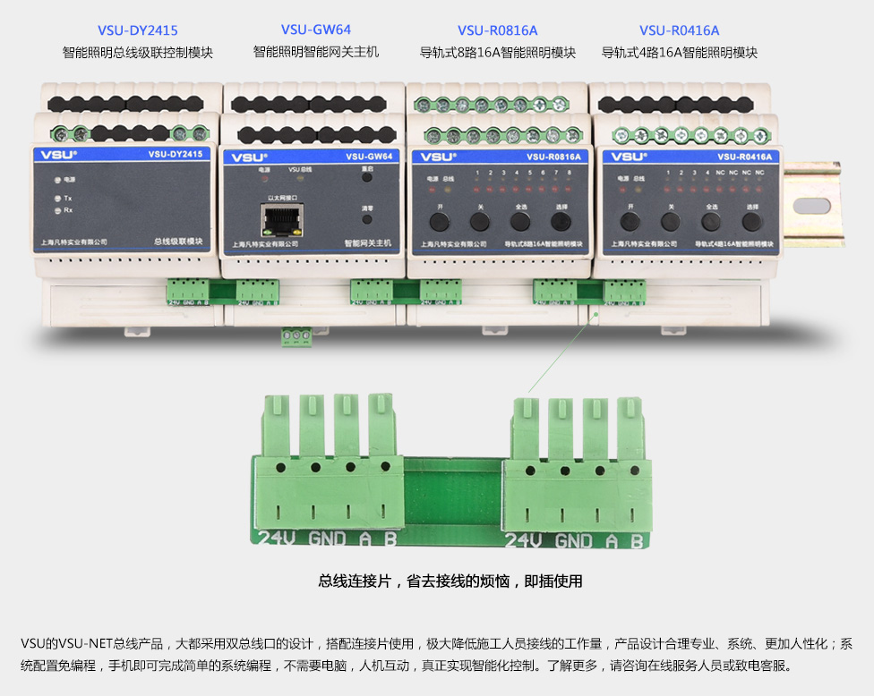 (6)網(wǎng)關(guān)主機(jī)通過網(wǎng)絡(luò)與IPAD、Andriod觸屏組成強(qiáng)大的控制系統(tǒng);通過VSU-Net總線與智能按鍵面板、有線觸屏形成可靠的智能控制系統(tǒng)。