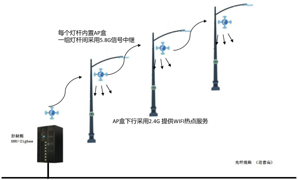 采用運(yùn)營(yíng)商光纖網(wǎng)絡(luò)比無(wú)線4G更加穩(wěn)定,在不具備部署光纖的區(qū)域,可以使用4G微基站。采用5.8G信號(hào)在燈桿間做Mesh,同時(shí)提供下行2.4G頻段作為AP上網(wǎng)使用。