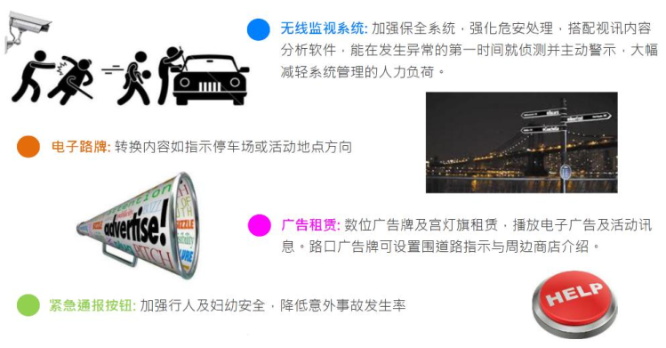 智慧路燈桿是一種集成各種信息設(shè)備技術(shù)創(chuàng)新復(fù)合應(yīng)用的智慧路燈產(chǎn)品,整個(gè)智慧燈桿內(nèi)包含路燈照明控制系統(tǒng)、WIFI天線基站、視頻監(jiān)控管理、廣告屏播控系統(tǒng)、城市環(huán)境實(shí)時(shí)監(jiān)測(cè)、緊急呼叫系統(tǒng)、水位監(jiān)測(cè)、充電樁系統(tǒng)和井蓋監(jiān)測(cè)系統(tǒng)等應(yīng)用。